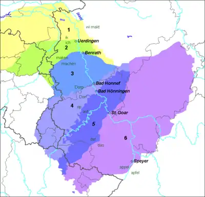 Таким образом, очертания современной вестфальской изоглоссы можно представить линией Иссельбург—Рес—Дорстен—Эссен—Лангенберг—Бармен—Радеформвальд—Хюккесваген—Майнерцхаген. В районе Хильхенбаха вестфальская линия натыкается на линию Бенрата и сливается с ней. В районе Бад-Закса изоглосса уходит от линии Бенрата и следует по линии Вернигероде—Деренбург—Хальберштадт—Грёнинген—Зеехаузен—Кальфёрде—Эбисфельде—Данненберг—Люнебург—Ратцебург. У Любека линия заканчивается.