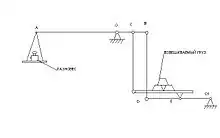 Для того, чтобы соотношение груз — разновес было в масштабе 10:1, необходимо соотношение длин плеч АO к CO также 10:1.