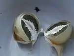 Перидий (оболочка) кожистый, гладкий, белый или кремовый, незрелая мякоть студенистая, с редечным запахом. При созревании перидий разрывается на две-три лопасти и имеет вид вольвы.