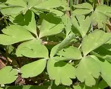 Простые, 4—5 см длиной, 8—11 см шириной, рассечённые на три первичных сегмента. Прикорневые не сохраняются.