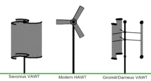 - с вертикальной осью вращения («карусельные» — роторные (в том числе «ротор Савониуса», точнее «ротор Братьев Ворониных» В начале октября 1924 года русские изобретатели братья Я. А. и А. А. Воронины получили советский патент на поперечную роторную турбину, в следующем году финский промышленник Сигурд Савониус организовал массовое производство подобных турбин. За ним и осталась "слава" изобретателя этой новинки), «лопастные» ортогональные — ротор Дарье);