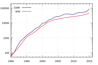 | Выработка электроэнергии, ГВт·ч | 38 | 176 | 577 | 732 | 918 | 1471 | 8284 | 12365 | 17420[13] | 19070[13] | 24744 | 27306 |