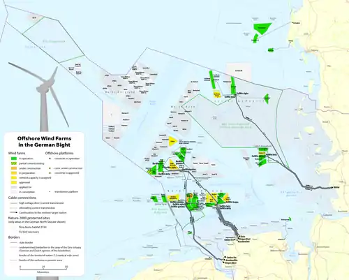 В Германии есть 1 коммерческий ветропарк в Балтийском море — Baltic 1 (en:Baltic 1 Offshore Wind Farm), два ветропарка в Северном море строятся — BARD 1 (en:BARD Offshore 1) и Borkum West 2 (en:Trianel Windpark Borkum) у берегов острова Боркум (Фризские острова). Также в Северном море в 45 км к северу от острова Боркум находится испытательный ветрополигон Alpha Ventus (en:Alpha Ventus Offshore Wind Farm)[7].