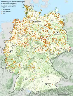 В 2011 году 8 % электроэнергии Германии было получено из энергии ветра[5]. Производство электричества ветроэлектростанциями сильно зависит от погодных условий. Так, в апреле 2011 года суммарная мощность ветроэнергетики Германии колебалась от менее 1000 МВт до 19000 МВт[5]. Ночью 7 февраля 2011 года ветряные электростанции выработали около 1/3 электроэнергии Германии[6].