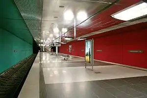 Однопролётная станция мелкого заложения находится необычно глубоко (18,5 м) в сравнение с соседними станциями. Планировалась и оформлялась архитектурным бюро Раупах & Шурк (нем. Raupach & Schurk)[3]. Опознавательный знак станции — это покрашенные путевые стены, западная в пурпурно-красный, а восточная в сине-зеленый цвет. Потолок оснащен отражающими алюминиевыми панелями с одним рядом ламп. Платформа выложена светлыми и темными гранитными плитами. Имеет два выхода по обоим концам платформы[2]. В северной части платформы расположен лифт, шахта которого облицована зелёным мрамором.