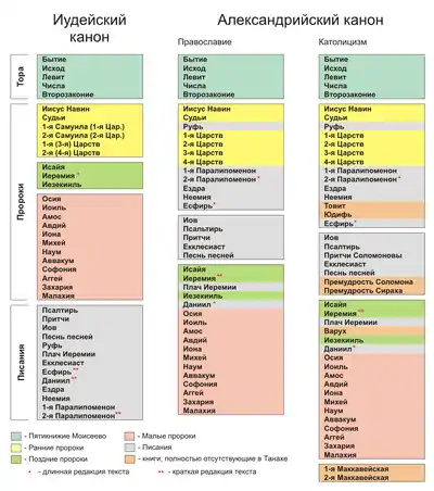 В Русской православной церкви каноническими книгами являются 39 книг Танаха, а неканоническими — 10 дополнительных книг Септуагинты (вторая книга Ездры, книги Товита, Иудифи, Премудрости Соломона, Премудрости Иисуса, сына Сирахова, пророка Варуха, Послание Иеремии, три книги Маккавейские) и третья книга Ездры, что отмечается в изданиях Библии Московской Патриархией с 1968 года. В состав греческой Библии входят книги Танаха и дополнительные книги Септуагинты без разделения их статуса[2].