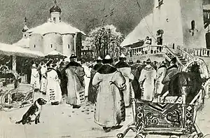 Известны также анархические «рыночные» собрания горожан на Торгу, прослеженные П. В. Лукиным в Киеве и западнославянских землях. В Новгородской республике тоже существовали своеобразные рыночные собрания. Например, в 1403 и 1406 годах решение городского веча выкликалось «на Торгу». Описывающая реалии XV века новгородская «Повесть о посаднике Добрыне»[3] явно намекает на отдельное от легитимного городского схода у церкви Иоанна Предтечи, стоящей «посреди города [Великого Новгорода] на Торгу». Примечателен отмеченный Д. Г. Хрусталёвым один из пунктов немецкого варианта договора Новгорода с Любеком и Готландом 1268—1269 гг. Согласно этому пункту, новгородцам запрещалось загромождать дорогу между Немецким двором и Николо-Дворищенским собором, То есть пространство, расположенное к северо-востоку от Св. Николы. Возможно, помимо простого запрета эксплуатации пролегавшего там ганзейского тракта, воспрещалось также стоять на этой дороге во время «рыночных» сходок.