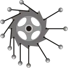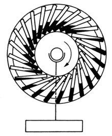 На рис. 1 показана одна из древнейших конструкций вечного двигателя. Она представляет зубчатое колесо, в углублениях которого прикреплены откидывающиеся на шарнирах грузы. Геометрия зубьев такова, что грузы в левой части колеса всегда оказываются ближе к оси, чем в правой. По замыслу автора, это, в согласии с законом рычага, должно было бы приводить колесо в постоянное вращение. При вращении грузы откидывались бы справа и сохраняли движущее усилие.
