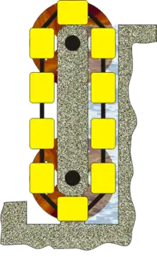На рис. 2 показано устройство ещё одного двигателя. Автор решил использовать для выработки энергии закон Архимеда. Закон состоит в том, что тела, плотность которых меньше плотности воды, стремятся всплыть на поверхность. Поэтому автор расположил на цепи полые баки и правую половину поместил под воду. Он полагал, что вода будет их выталкивать на поверхность, а цепь с колёсами, таким образом, - бесконечно вращаться.