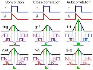 Если и — два независимых случайных числа с функциями распределения вероятностей соответственно f и g, тогда взаимная корреляция f g соответствует распределению вероятностей выражения . Напротив, свёртка f g соответствует распределению вероятностей суммы .