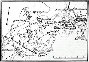 5 июля около 6 часов утра произошла стычка передовых кавалерийских частей с противником. На подкрепление их были высланы казаки под начальством Иловайского и вслед за тем вся кавалерия корпуса с конной артиллерией под начальством Бенкендорфа.