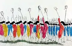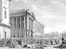 Бюсты Неккера несли по всему городу. Шествие двигалось по улицам Сен-Мартен, Сен-Дени и Сен-Оноре, и с каждым шагом толпа все увеличивалась. Таким образом, шествие дошло до Вандомской площади, и там толпа обнесла бюсты вокруг статуи Людовика XIV. Сюда явился отряд драгун немецкого полка; он пытался разогнать шествие, но был быстро обращен в бегство градом камней[10]; толпа продолжила свой путь и дошла до площади Людовика XV; здесь на неё напали драгуны принца Ламбеска; толпа рассеялась, часть побежала к набережной, а другая устремилась в Тюильри через ближайший мост. Ламбеск, во главе своих солдат, с саблей наголо, преследовал бегущих в самом саду; он бросился на безоружную толпу, совершенно не участвовавшую в шествии и случайно мирно гулявшую по саду. Крики «К оружию!» вскоре начали раздаваться повсюду — в Тюильри, в Пале-Рояле, в городе и в предместьях[11].