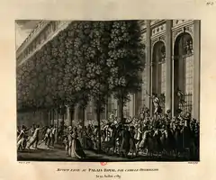 12 июля был прекрасный воскресный день. Париж узнал об отставке Неккера и об его отъезде за границу после полудня; эту меру сочли началом выполнения заговора, приготовления к которому уже давно намечались. Через короткое время весь город пришёл в весьма сильное волнение; повсюду собирались толпы народа, более десяти тысяч человек сошлось в Пале-Рояле, раздраженные узнанной новостью[8].