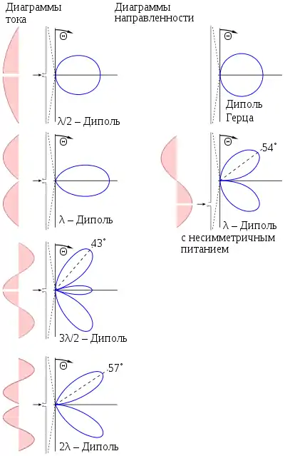 В зависимости от отношения длины вибратора к длине волны и места включения в него фидера его диаграмма направленности принимает вид, изображённый на рисунке: