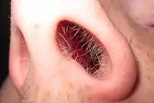 У людей вибриссами (лат. vibrissae[6]) называются щетиноподобные волосы в преддверии носа у входа в полость носа (в ноздрях), которые образуя своеобразную волосяную сетку выполняют защитную функцию, вдобавок к слизи и мерцательному эпителию, от попадания крупных предметов (к примеру, летающих насекомых) и фильтруя способствуют задержке крупнодисперсной (от 30 мкм и более) пыли во вдыхаемом воздухе[7][8]. Они растут перпендикулярно к поверхности кожи и не имеют мышечных волокон у основания, начинается их рост c пубертатного периода[6].