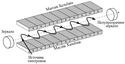 Вигглер, помещённый в резонатор (например, два параллельных зеркала резонатора Фабри — Перо), — простейшее устройство лазера на свободных электронах.