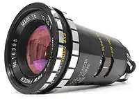 - Первые телекамеры, снабжались более дешёвым телескопическим визиром, или, как например «EMI Emitron», видоискателем, сходным по принципу действия с двойными форматными или двухобъективными зеркальными фотоаппаратами[31]