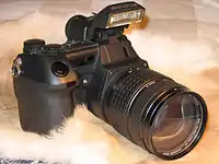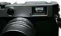 Гибридный видоискатель — патентованная разработка компании Fujifilm, которая впервые применила её в цифровом беззеркальном фотоаппарате с матрицей размером APS-C и несменным объективом Fujifilm FinePix X100, а затем — со сменными объективами Fujifilm X-Pro1. Общий принцип работы заключается в совмещении изображений оптического видоискателя и ЖК дисплея с помощью призмы. Гибридный видоискатель в оптическом режиме позволяет наблюдать яркое, без пересветов изображение скомпенсированного параллаксного видоискателя и видеть информацию ЖК дисплея об основных настройках (в том числе и гистограмму)[35]. Гибридный видоискатель в режиме электронного видоискателя позволяет выводить картинку с матрицы в реальном времени, аналогичную дисплею, что позволяет видеть изображение, которое будет запечатлено (с учётом установленной экспозиции, что особенно важно в тёмное время).
