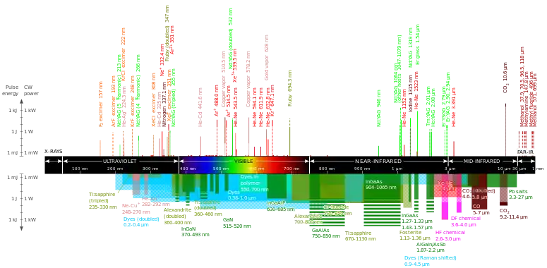 Типы лазеров с четкими линиями излучения приведены в верхней части, в то время как нижняя отображает лазеры, способные излучать в диапазоне длин волн. Высота линий и полос соответствует максимальным энергиями коммерчески доступных лазеров, сплошные линии - непрерывное излучение, пунктир - импульсное. Сплошные зеленые квадраты - мощность одиночного полупроводникового лазера, горизонтальные зеленые линии - увеличение мощности множественных лазеров. Для Ar+-Kr+ подписаны лишь основные линии, остальные обозначены короткими линиями. Шкала длин волн сочетает линейный и логарифмический масштабы. Цветом выделены различные материалы накачки лазеров (см. описание рисунка, на английском языке). Данные приводятся в соответствии с Handbook of laser wavelengths [1], при этом в таблице добавлены новые типы лазеров, включая полупроводниковыеГазовые лазеры