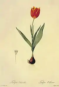 Во второй половине XVIII века ботаники описали ряд средиземноморских форм, большинство которых в современной систематике считаются формами тюльпана Геснера; в ранге вида признаются лишь описанный в 1776 году Петером Палласом Tulipa biflora (тюльпан двуцветковый) и описанный в 1794 году Альбрехтом Ротом Tulipa suaveolens[18]. В 1803—1815 году Пьер-Жозеф Редуте обобщил накопленные знания в фундаментальном труде «Лилейные». Редуте описал как новые виды Tulipa agenensis (тюльпан аженский) и Tulipa clusiana (тюльпан Клузиуса), не зная, что эти растения уже были описаны как Tulipa praecox и Tulipa oculis-solis. Хотя в последующих изданиях «Лилейных» Редуте исправил эту ошибку, предложенные им названия закрепились в ботанической номенклатуре, а параллельно признававшееся название Tulipa praecox применялось к обоим этим видам[19]. В 1820-е и 1830-е годы, по мере описания новых видов, произошло первое дробление рода: Дэвид Дон выделил из Tulipa род Orythyia (типовой вид — тюльпан одноцветковый), Константин Рафинеск выделил «североамериканские» роды Liriactis (тюльпан звёздчатый), Liriopogon (тюльпан лесной) и Podonix (тюльпан двуцветковый). Описанные Рафинеском таксоны были отвергнуты последующими систематиками, а Orythia признаётся в ранге подрода рода Tulipa[20].