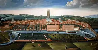 Слева находится дом под названием Каслфилд, служивший резиденцией семьи Борроу (Borrow)[2]. Слева от центра расположен Эксетер-Хауз, не сохранившийся до сегодняшнего дня, но ставший известным благодаря тому, что в нём останавливался Красавчик принц Чарли в тот день, когда он решил развернуть свои шотландские войска вместо того, чтобы идти отбирать корону в Лондон. Интерьер одной из комнат дома воссоздан в экспозиции музея Дерби. Большие здания-фабрики относятся к фабрикам в долине реки Деруэнт[3], в данное время входящими в список объектов Всемирного наследия ЮНЕСКО в Великобритании. Одно из зданий в настоящее время снесено, а в одной из фабрик слева расположен Промышленный музей Дерби.