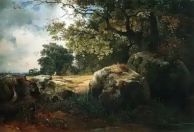 В центре картины изображена поляна, освещённая ярким солнечным светом. Справа от неё находятся деревья и валуны, поросшие мхом и травой. На переднем плане, за двумя крупными валунами находится дуб, листва которого освещена солнцем. У дальнего края поляны видна фигурка сидящей женщины. Вдали, у левого края полотна, под затянутым облаками небом виден небольшой кусочек моря[4].
