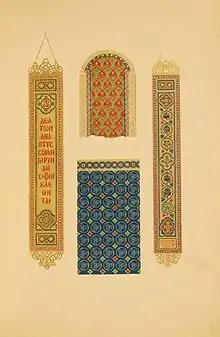 К книге прилагалась закладка в виде широкой ленты из разноцветного шёлка, серебряных и золотых нитей. На ней вышит греческий текст из трагедии «Эрехтей» Еврипида: «Разверни эти говорящие листы, прославляющие мудрых»[18].