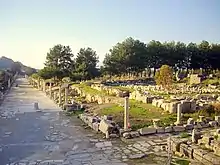 В Древней Греции были выработана принципы городской планировки, позднее ставшие стандартом в Средиземноморье. Их ключевыми особенностями было наличие широких мощёных улиц, украшенных колоннадами (стоа) и портиками, прямоугольных открытых пространств и монументальных общественных сооружений[118]. Одним из принципов, которым руководствовались византийцы в планировке городов, была имитация древности. Очевидным примером являются форумы Константинополя, построенные в подражание аналогичным сооружениям Рима, с целью подчеркнуть политическую преемственность двух столиц. Наподобие форума Траяна были организованы площади в городах Сирии — Антиохии, Дамаске, Филиппополисе Аравийском и Герасе. Городские пространства Юстинианы Примы, одного из немногих городов, основанных в византийский период, моделировались по образцу форума Константина[119]. В середине VI века классическое ви́дение города сохраняло свою актуальность, и придворный историк императора Юстиниана I Прокопий Кесарийский так описал реконструкцию, проведённую в Антиохии после разрушений, вызванных захватом города персами в 540 году: «[император] разделил город площадями и галереями, наметил улицами все проходы, провёл водопроводы, устроил фонтаны и цистерны. Он построил в городе театры и бани и все то, чем может гордиться город, украсив его и всякими другими общественными постройками, в чём обычно проявляется благосостояние и богатство города»[120]. Впрочем, как отмечает британский историк Хью Кеннеди, описание Прокопия не следует считать ни типичным для городов Сирии, ни достоверным[121].