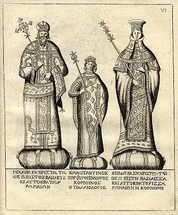 Правивший четверть века Михаил III (842—867) не имел ни способности, ни желания управлять государством. Ему было только два года, когда смерть отца сделала его императором. Согласно обычаю, регентом при нём должна была быть его мать Феодора, однако желанием покойного императора в число регентов были включены дядя императрицы Мануил[прим. 9] и логофет Феоктист. Благодаря легкомысленному характеру Михаила опека над ним продолжалась и после срока, предусмотренного законодательством, однако в 856 году по инициативе другого брата Федоры, Варды, чувствовавшего себя обделённым при дворе, произошёл переворот[103]. Феоктист был убит, Михаил был провозглашён единственным императором при фактической передаче власти Варде. Феодора оставалась во дворце ещё два года, пока не была пострижена в монахини вместе со своими дочерьми. Через восемь лет Варда, возведенный в кесари в 862 году, был свергнут в результате заговора, организованного новым фаворитом Михаила Василием. 21 апреля 866 года Василий собственноручно убил Варду, а месяц спустя Михаил короновал его как со-императора. Их совместное правление продолжалась менее полутора лет. В сентябре 867 года Василий, опасаясь возвышения очередного фаворита, сверг Михаила и стал основателем новой династии[104][105].