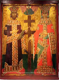 Не известно точно, когда в эту церемонию было включено помазание на царство, которое со второй половины IX века считалось на Западе необходимым условием легитимного императора. По мнению Б. А. Успенского, впервые помазание византийского императора произошло при преемнике Константина, Романе II (959—963)[52]. В западной историографии распространена теория о том, что традиция помазания на царство в Византии началась 16 мая 1204 года, когда воцарился первый латинский император, Балдуин Фландрский (1204—1205). Описание этого ритуала, приведённое у Робера де Клари, позволяет сделать вывод, что Балдуину помазали предплечье, как это было сделано при помазании короля франков Пипина Короткого (751—768). Впоследствии в Византии помазывали голову коронуемого монарха[53]. По версии Г. А. Острогорского, обычай миропомазания императора патриархом был впервые применён никейским императором Феодором I Ласкарисом (1205—1221)[54]. Другая группа византинистов, начиная с Ф. И. Успенского (Ш. Диль, Н. Бейнс и др.), предполагает, что обряд миропомазания существовал со времён императора Маркиана (450—457). Наконец, ряд историков полагают, что церковное коронование императоров патриархами вообще не имело места в Византии[55].