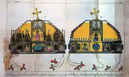 ![]() Император Василий II в триумфальном облачении, на голову которого ангелы опускают императорскую корону | |