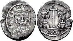 В конце своего непродолжительного царствования Тиберий II (578—582), не имея наследника, устроил помолвки своих дочерей — Константины с полководцем и триумфатором 582 года Маврикием и Хариты с патрикием Германом. Обоих зятьёв он сделал цезарями. Перед смертью Тиберий сделал окончательный выбор в пользу Маврикия, возложив «венец и бармы» на Маврикия (582—602)[69]. Маврикий, человек недалёкого ума[70] и лишённый государственных талантов, после серии военных неудач и природных катастроф[прим. 6], утратил поддержку народа и недовольной скупостью императора армии. Во главе мятежа встал солдат Фока (602—610). Окончательно судьба империи решилась благодаря активной позиции партий ипподрома (демы). После того как Маврикий бежал, а Фока ещё не выразил явно желания стать императором, партии предпочли Фоку патрикию Герману. На третий день после венчания на царство Фока в белой колеснице отправился во дворец, разбрасывая на своём пути золотые монеты; войскам был направлен согласно обычаю подарок. На пятый день состоялась коронация его супруги Леонтии. После того как партии попробовали продолжить беспорядки и требовать возвращения Маврикия, свергнутый император и его сыновья были казнены[72].