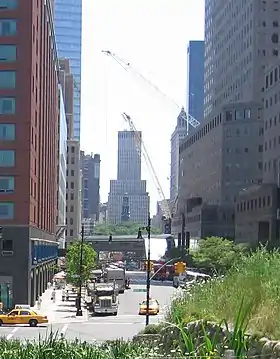 Вид в восточном направлении на Мемориал голоду в Ирландии (слева) и строящийся Всемирный торговый центр 1 в феврале 2013 года