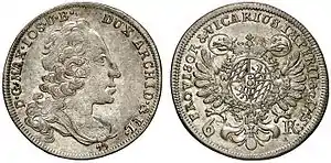 В 1724 году между несколькими католическими правителями немецких государств была подписана уния дома Виттельсбахов, которая регулировала ряд вопросов и в том числе занятие должности викариев курфюрстами Баварии и Пфальца. Они договорились совместно выполнять функции викариев. Когда, после смерти императора Карла VI, курфюрсты Баварии Карл Альбрехт (будущий император Карл VII) и Пфальца Карл III Филипп объявили себя викариями, представители евангелического сословия заявили протест. Уния дома Виттельсбахов не была признана ни императором, ни имперским законодательством и по своей сути являлась частным договором между несколькими влиятельными князьями. Конфликт был исчерпан 18 января 1741 года принятием решения о совместном занятии одного места имперского викария. Общая позиция двух курфюрстов проявилась, в частности, чеканкой викариатных монет с изображением обоих представителей дома Виттельсбахов[36]. Особенности данных выпусков состояли в том, что на землях обоих курфюрстов чеканили монеты с двойным изображением. При этом в Пфальце выпустили 1⁄4[45], ½[45] и 1[53] талер с двумя лицами на аверсе, в Баварии — 3[54] и 6[54] крейцера, а также золотые 1 и 2 гульдена[55] (с изображением одного баварского курфюрста), талер[56] (с изображением двух курфюрстов).