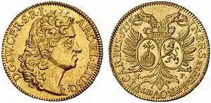 В 1711 году, когда умер император Иосиф I, баварский курфюрст Максимилиан II находился вне пределов своих владений[50], на него была наложена имперская опала, то есть по своей сути его объявили вне закона. Страна была занята австрийскими войсками в ходе войны за испанское наследство. Соответственно спор о том, кому следует занять должность викария, был на тот момент неактуален. Указание на викариатство курфюрста Пфальца Иоганна Вильгельма присутствует на талере[51], 1⁄4[46], 1[46], 2[52] и 3 дукатах[52].