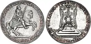 Памятные монеты Фридриха Августа II чеканили нескольких типов. В 1740 году были выпущены викариатные дукаты[33] и специесрейхсталеры[37]. На аверсе расположен профиль монарха в доспехах, на реверсе — двуглавый орёл с гербовым щитом в центре и круговой надписью «IN PROVINCIIS IUR. SAXON. PROVISOR ET VICARIUS» («Имперский викарий в провинциях саксонского права»). На монетах 1741 и 1742 года на аверсе помещён курфюрст на лошади, на реверсе — пустой трон с имперскими регалиями на нём. Надпись на викариатных дукатах, курантных талерах, ½ талера, двойных и обычных грошах идентична легенде на монетах 1740 года.