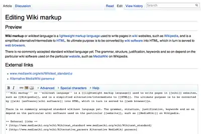 - Особый язык разметки — так называемая вики-разметка, которая позволяет легко и быстро размечать в тексте структурные элементы и гиперссылки; форматировать и оформлять отдельные элементы[7].