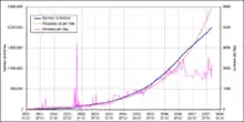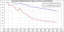 Википедия получила ранних участников из «Нупедии», сообщений на Slashdot и за счёт индексации поисковыми машинами. Она выросла до примерно 20 000 статей и 18 языковых разделов к концу 2001 года. К концу 2002 года она достигла 26 языковых разделов, 46 к концу 2003 года и 161 к последним дням 2004 года[38]. «Нупедия» и Википедия сосуществовали, пока серверы первой не были навсегда отключены в 2003 году (текст «Нупедии» был включён в Википедию). Английская Википедия прошла отметку в 2 млн статей 9 сентября 2007 года, что делает её крупнейшей энциклопедией, собравшей всё и затмившей даже энциклопедию Юнлэ (1407), которая держала рекорд ровно 600 лет[39].