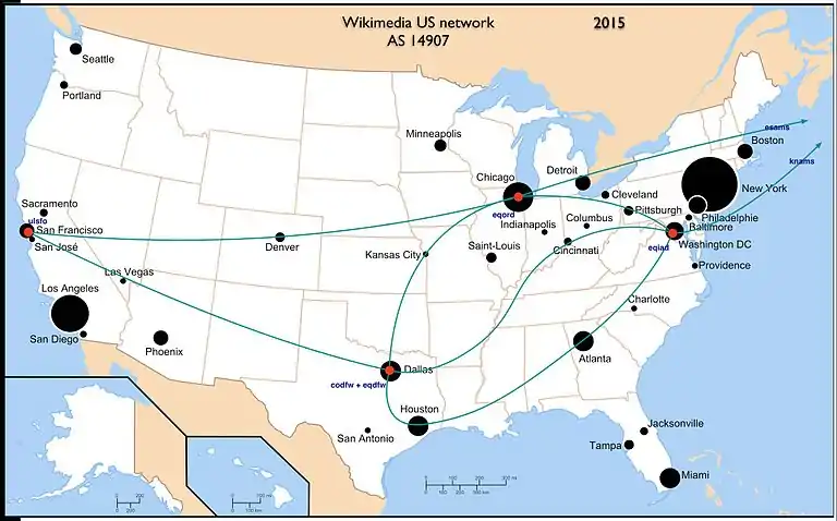 Сетевая топология с 2015 года. Серверные кластеры в США: Сан-Франциско — ulsfo (caching); Даллас, Техас — eqdfw (networking); Карролтон, Техас — codfw (application services); Чикаго, Иллинойс — eqord (networking); Ашберн, Виргиния — eqiad (application services). В Амстердаме — esams (Caching) и knams (Networking)