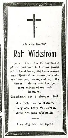 Рольф Викстрём (норв. Rolf Wickstrøm) (9 декабря, 1912 год, Кристиания — 10 сентября 1941 год, Осло) — участник норвежского анифашистского движения Сопротивления, профсоюзный деятель, рабочий вагоноремонтного завода. Расстрелян немецкими оккупационными властями за организацию забастовки.