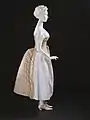 На этот короткий период изменилась модная линия: лиф спустился глубоко на бока, тесно облегая тело, и тем самым ограничивал движения. Насколько сократилась юбка спереди, настолько увеличился её шлейф сзади. Узкие рукава, опущенные плечи и высокие каблуки придавали тонкой женской фигуре некую хрупкость.