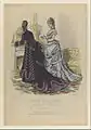 - Платья для визитов (Visiting dress) — поскольку визиты обычно наносили до полудня, платье должно было отвечать правилам дневного туалета (отсутствие декольте, открытых плеч и рук). Платье для визитов обязательно дополнялось шляпкой и перчатками.