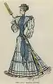- Платье для прогулок (Walking-out dress) — выходное платье, в котором дама появлялась на улице для любого вида прогулок на воздухе, кроме верховых. Полагалось иметь несколько прогулочных платьев: один для хорошей погоды, другой для сомнительной или дождливой и верхнюю одежду для холодных времен года. Разумеется, в любое время года обязательно наличие головного убора и перчаток.