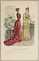 - Вечернее платье (Evening dress) — парадный туалет для официальных мероприятий, таких как званый ужин, большой прием, посещение театра и оперы. Вечерние платья обязательно имели глубокое декольте и короткие рукава — эта открытость отличала данный наряд от любого другого. Платье шилось по правилам моды данного сезона из дорогих материалов и богато украшалось. Обязательным аксессуарами были перчатки, драгоценности и верхняя накидка по необходимости.