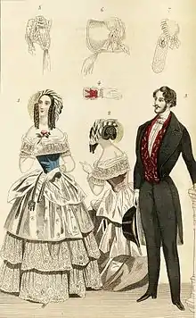 В начале правления королевы Виктории в моде царила эстетика романтизма. Этот стиль требовал тонкой и несколько заниженной талии. Для достижения нужного эффекта использовался специальный корсет, который шнуровался до самых бедер. Постепенно, прежде огромные рукава становятся менее массивными и укорачиваются, плечи сужаются, а юбка-колокол удлиняется и стремительно набирает в объёме: под верхнюю ткань надевали множество слоев накрахмаленных нижних юбок, которые должны были поддерживать форму платья.