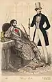 - Перчатки являлись обязательным элементом выходного костюма для соблюдения приличий. «Советы по этикету», изданные в 1837 году, давали рекомендации относительно перчаток как мужчинам, так и женщинам[12] В справочниках была информация не только о том, когда следует носить перчатки, но и какие перчатки надевать по определенному поводу. Перчатки без пальцев — митенки — были популярны в 1870-е годы; изготавливались чаще всего из чёрного кружева и по длине могли доходить до середины предплечья или до локтей. Митенки подходили для более торжественных случаев, чем обычные перчатки, например, для похода в театр или на званый ужин. Перчатки были предпочтительнее днем, а митенки — вечером. С митенками можно было свободно носить кольца, а в то время как обычные перчатки могли дополняться браслетами. Также, перчатки быстро пачкались, поэтому в справочнике «Как одеваться подобно леди на 15 фунтов в год» (1874) городским жительницам была дана рекомендация держать в гардеробе 7 пар лайковых перчаток. Предпочтительные цвета: белые, бежевые и жёлтые. В 1850-е годы в моду вошли цветные перчатки, хоть их порою считали вульгарными. В 1854 году рекламировались такие цвета, как гранатовый, Наполеон, смородиновый, оливковый, Аделаида, рубиновый, каштановый, кофейный, миртовый[12].