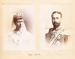 В июне 1883 года состоялась тайная помолвка, а 1 июля о ней объявили официально[31]. Королева брак одобрила, уточнив, что жених и невеста «имеют схожие мысли и интересы и оба — сущие англичане с головы до ног»[32]. Свадебные торжества собрали огромное количество представителей царствующих домов со всей Европы, среди которых были королева Виктория, принц и принцесса Уэльские, кронпринц и кронпринцесса Германские, великие князья Романовы, представители Габсбургов, Вюртембергов и прочие. Событие омрачала смерть в начале марта Джона Брауна — преданного слуги британской королевы, а в конце месяца в Каннах от последствий гемофилии скончался Леопольд, герцог Олбани — младший сын королевы. Планировалось, что свадьба состоится не раньше мая, но Виктория-старшая назначила её на 30 апреля 1884 года. В этот день в Дармштадте Виктория вышла замуж за Людвига[33]. На невесте было белое платье из хонитонского кружева, украшенное розами и миртом, длинная вуаль, тиара из бриллиантов и сапфиров и венок из флёрдоранжа и мирта, преподнесённый королевой. В сопровождении бабушки и великого князя Сергея Александровича невеста в открытой карете подъехала к месту гражданской регистрации брака, а после — в церковь для религиозной церемонии. Виктория шла к алтарю в сопровождении отца и своего будущего свёкра принца Александра. Людвиг был одет в форму морского офицера. В честь свадьбы от британской королевы ему был пожалован большой крест ордена Бани. После окончания церемонии королева поцеловала Людвига и пожала руки отцам жениха и невесты и гости отправились во дворец для свадебного ужина[34].