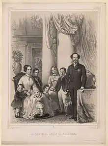 В 1842 году он женился первый раз на своей двоюродной сестре Адельгейде Австрийской (1822—1855), дочери габсбургского вице-короля Ломбардии Райнера Иосифа, у них родились восемь детей, из которых выжили пять: