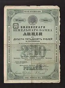 В период с 1871 по 1873 годы, в процессе осуществлявшегося реформирования кредитных отношений (1860—1875), в Российской империи было учреждено 11 акционерных ипотечных банков, десять из которых просуществовали вплоть до Октябрьской революции — Московский, Петербургско-Тульский, Виленский, Ярославско-Костромской, Бессарабско-Таврический, Донской, Киевский, Харьковский, Полтавский и Нижегородско-Самарский. Из них только Виленский земельный банк, после распада Империи оказавшийся на территории суверенной Польши, был упразднён в 1939 году с началом II Мировой войны. Учредителями Виленского банка в 1872 году выступили крупные местные землевладельцы: светлейший князь П. Л. Витгенштейн, графы Н. Н. Зубов, А. Я. Платтер и другие при активном участии петербургских банкирских домов И. Е. Гинцбурга, Л. М. Розенталя, Э. М. Мейера, а также В. Ф. Захерта, Моес и К° из Белостока.[2]