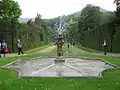 Дальше по каналу располагается театр на воде с рыбьими прудами и радужным фонтаном. Дальше, слева от канала находится лабиринт из самшита, а справа — статуя Времени (старик с крыльями, несущий на своей спине кубооктаэдр, полёт которого символизирует превосходство времени над пространством). Затем, у фонтана Пилла канал перпендикулярно пересекается с главной аллеей, ведущей прямо к вилле. Поворачивая направо, на аллею в сторону виллы, слева можно увидеть Кроличий остров и многовековое дерево. По краям аллеи располагаются статуи и фонтаны, а конце ступеньки с написанными на них стихами, ведущие к площади перед виллой, где находится фонтан Откровения.